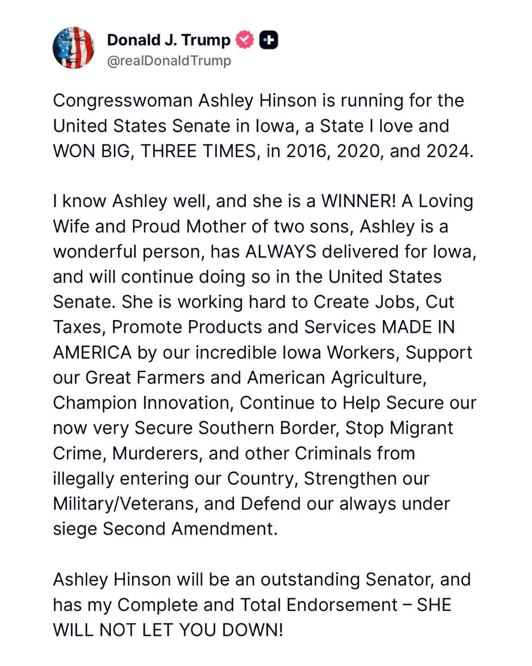 Marion, IA –– Tonight, President Donald J. Trump endorsed Congresswoman Ashley Hinson for Senate. This is a tremendous honor. We are going to keep Iowa RED and keep making America great again. Here’s what he said: